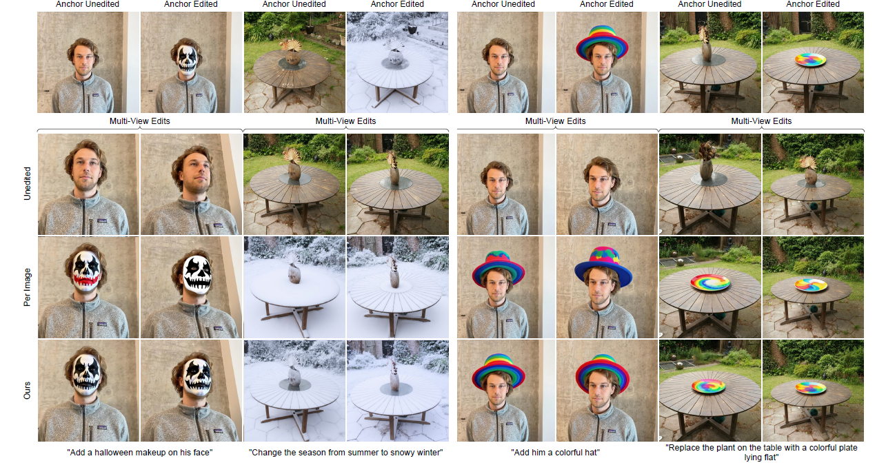 Image editing methods applied independently to multi-view images often produce inconsistent edits across views. Our method improves multi-view consistency, and can be easily be combined with different 2D Editing methods. .